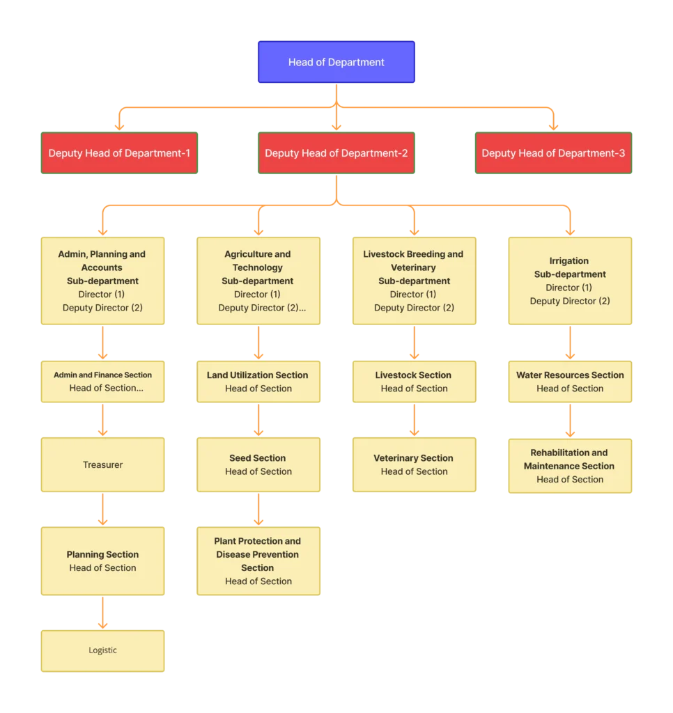 The Department of Agriculture, Livestock and Irrigation is headed by one Head of Department and three Deputy Heads. It is divided into four Sub-departments: Administration, Planning and Finance Sub-department, Agricultural Technology Sub-department, Livestock and Veterinary Sub-department, and Irrigation Sub-department.