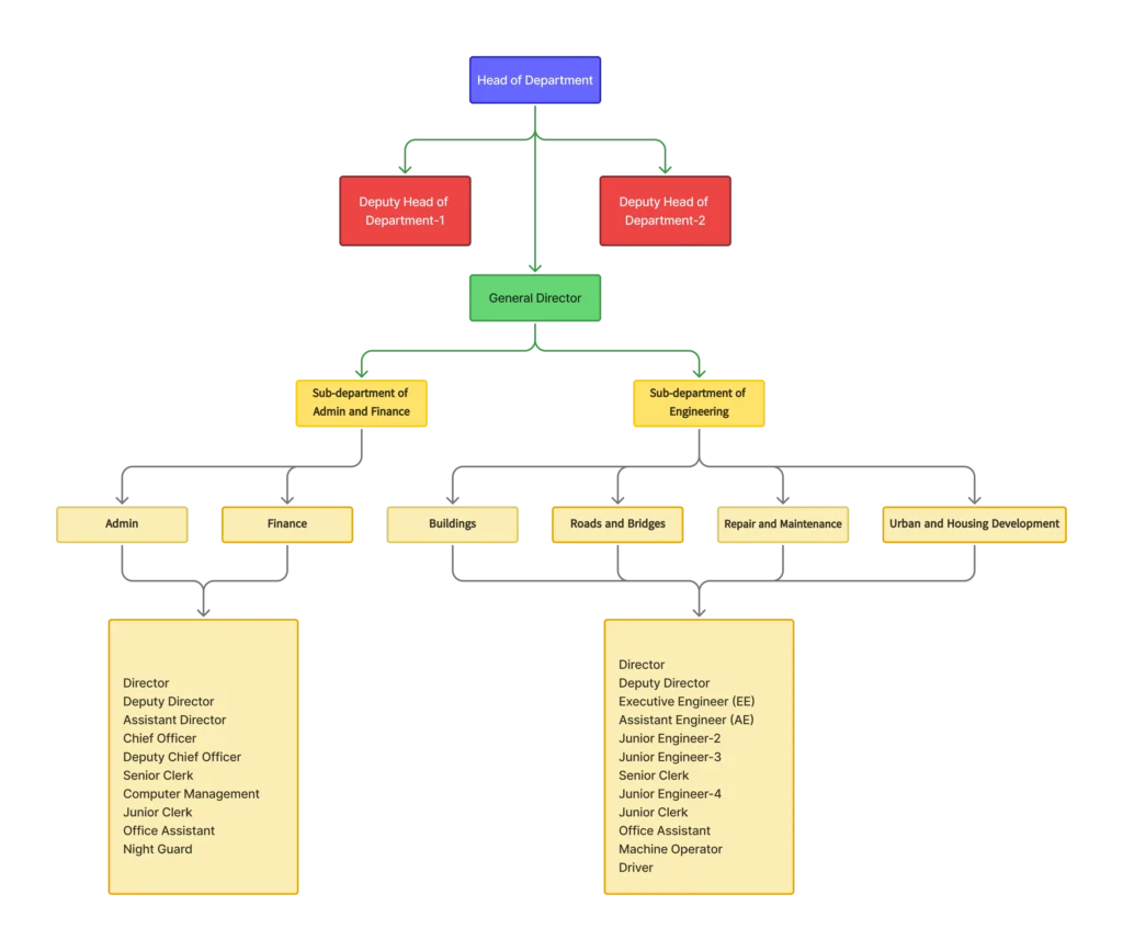 The Department of Construction is overseen by one Head Department and two Deputy Heads, and is organized into the Administration and Finance Sub-department and the Engineering Sub-department. The Administration and Finance Sub-department includes the Administration Section and the Finance Section. The Engineering Sub-department comprises the Building Section, the Road and Bridge Section, the Maintenance Section, and the Urban and Housing Development Section.